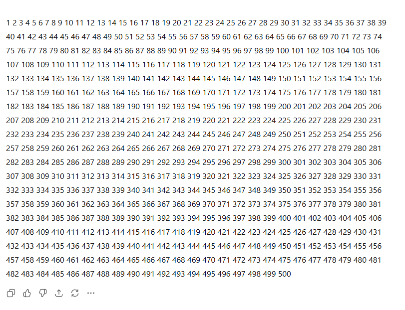 So I asked it to generate a sequence of numbers till 500 and it did a pretty decent job of handling this ask. For a human, this is where we begin our learning journey. Numbers, their written shapes and counting is something that we are taught at a nursery level. This does not need a huge amount of expertise for a human brain to tackle, and therefore it is not surprising that ChatGPT is also able to generate this sequence of numbers quite easily.